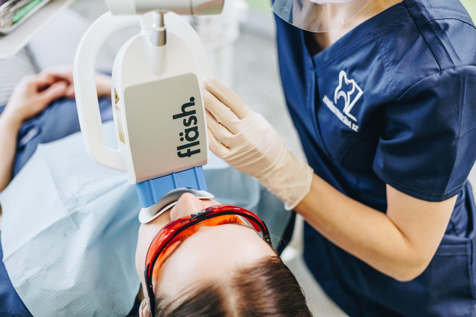 Mūsu klīnikas pakalpojumu klāstā pieejama arī profesionālā zobu balināšana ar Flash sistēmu. Balināšana tiek veikta ar 6% ūdeņraža peroksīda gelu, ko aktivē Flash gaismas avots, tādejādi procedūra ir droša zobiem un komfortabla. Procedūra veidota  tā, lai maksimāli īsākā laikā sasniegtu labāko balināšanas rezultātu ar vismazāko zobu jūtīgumu. Procedūra ieteicama pacientiem pēc 18 gadu vecuma. Balināšanas laikā uz jūsu zobiem vairākkartīgi tiek aplicēts balināšanas gels, īpašu uzmanību pievēršot gļotādu, lūpu un vaigu  aizsardzībai. Balināšanas vizīte ilgst aptuveni pusotru stundu. Pirms un pēc procedūras tiek novērtēta jūsu zobu krāsa.